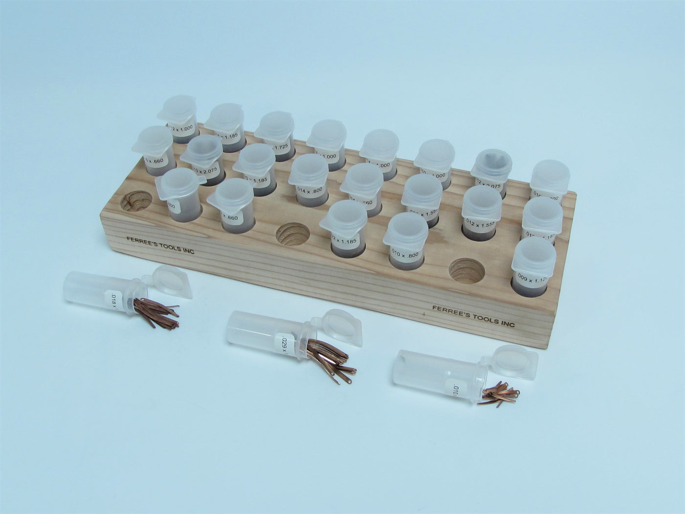 The springs are available in individual sizes (specify thickness and length), sold in dozens or hundreds. Also, available are two handy assortments, packaged in individual vials, mounted in an attractive wood holder, in 350 and 500 quantities.