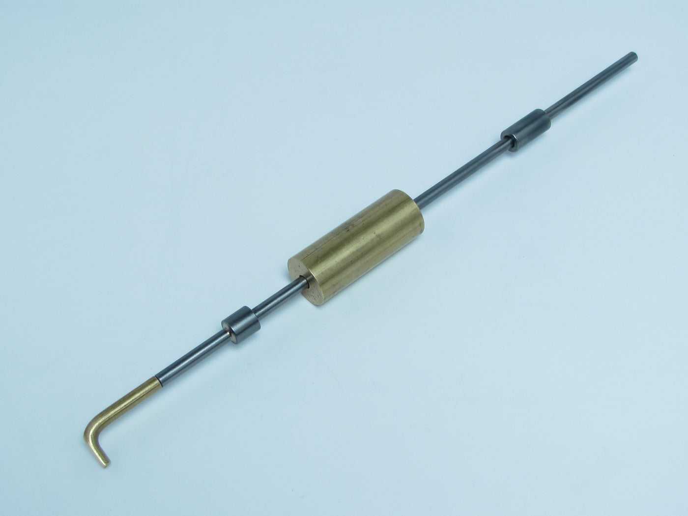This tool has one removable brass end and the other end is concave. The length is approximately 14" long. The shaft is 1/4" diameter steel and the heavy brass sliding weight is a full 1" diameter.